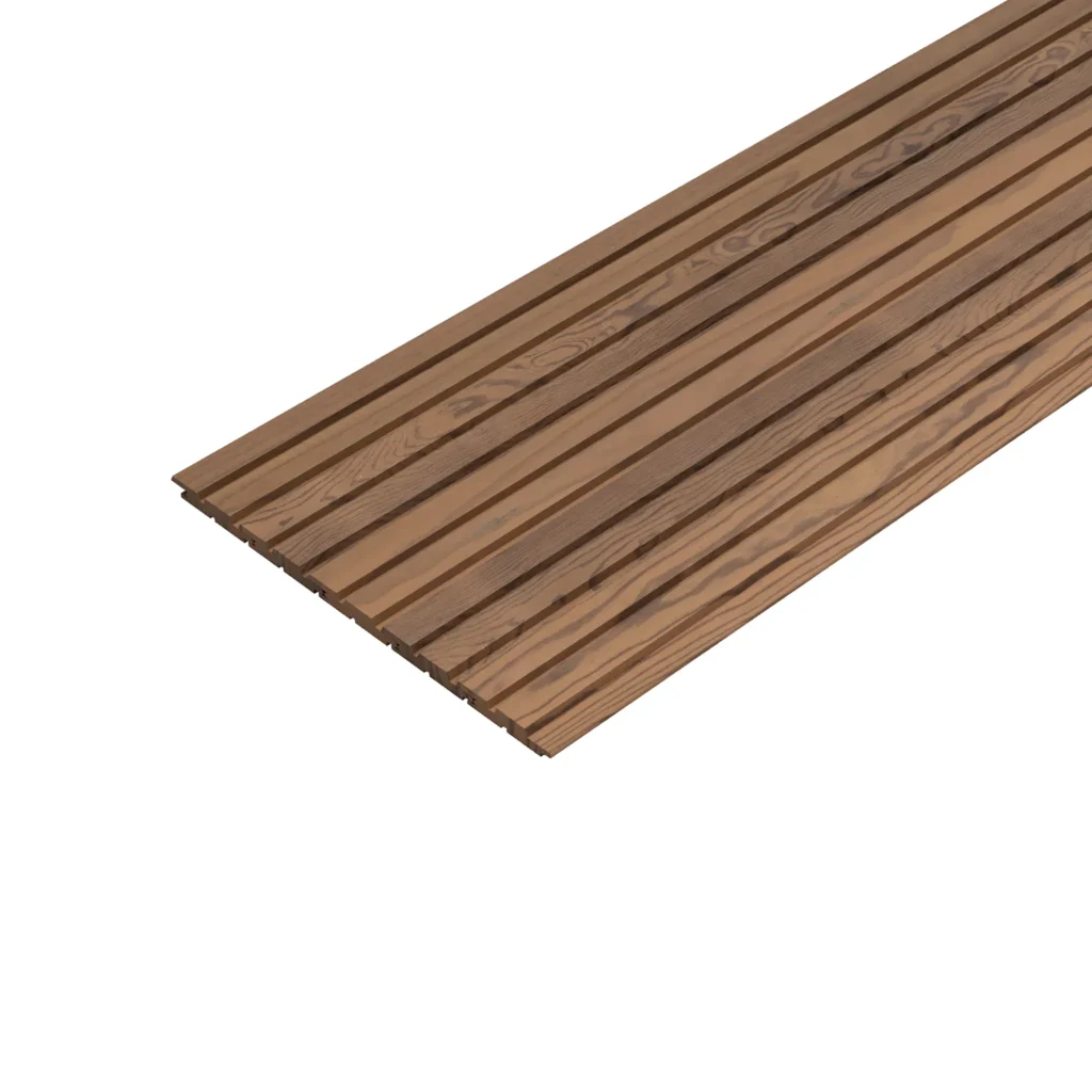 Perfil ranurado de madera maciza termotratada, diseñado con líneas paralelas que realzan la textura natural y aportan profundidad visual. Su sistema machihembrado oculto permite un montaje limpio, rápido y sin fijaciones visibles.